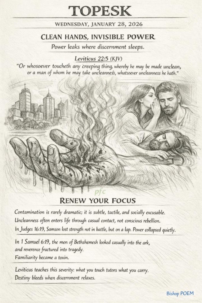 Leviticus teaches this severity: what you touch tutors what you carry. Destiny bleeds when discernment relaxes.