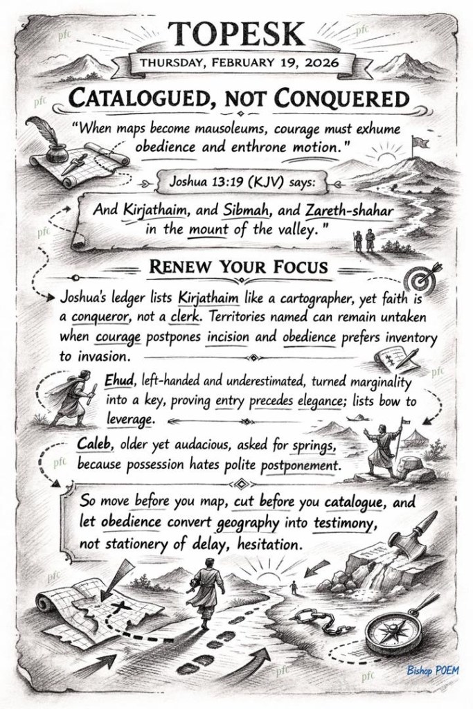 Joshua’s ledger lists Kirjathaim like a cartographer, yet faith is a conqueror, not a clerk. Territories named can remain untaken when courage postpones incision and obedience prefers inventory to invasion.