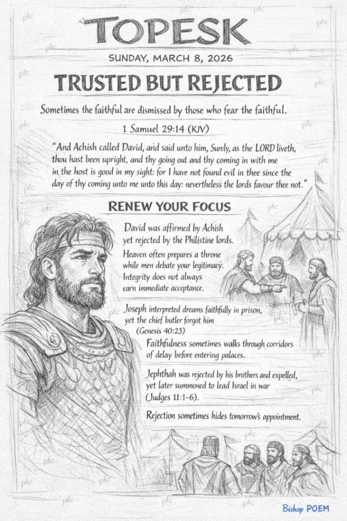 David was affirmed by Achish yet rejected by the Philistine lords. Heaven often prepares a throne while men debate your legitimacy. Integrity does not always earn immediate acceptance.